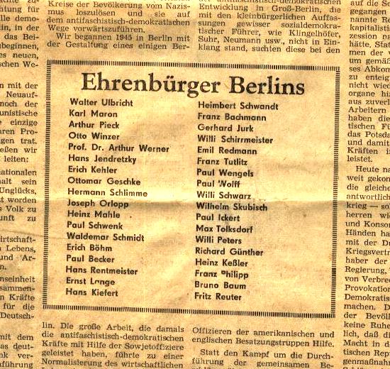 ( gleich oben rechts neben Ulbricht ), weil Heimbert Schwandt in Neu-Westend [Bezirk Charlottenburg] wohnte und somit im britischen Sektor von Berlin-West. Meine Eltern blieben da auch wohnen, weil meine Oma ganz sicher dem Irrglauben anhing: "Der Sozialismus kommt auch noch nach Charlottenburg". Heute ist mein Vater nicht in der offiziellen Liste des Berliner Senats [gibt es die überhaupt, die Liste?] als Ehrenbürger aufgeführt. Vielleicht weil ihm in einem Prozess wegen Flugblattverteilens auf dem Ku-damm gegen den Korea-Krieg der USA in den 1950er Jahren die Anwartschaft auf eine Rente wegen Widerstands gegen das NS-Regime mal aberkannt wurde? [Wie komme ich an sein Gerichtsurteil aus 1953?]